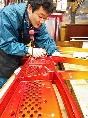 まず、アクションの動きをスムーズににしてあげる。鍵盤の深さ等もオーナーとの相談により0.5ミリくらい浅く、または深くしてあげる。当然、整調が必要となってきます