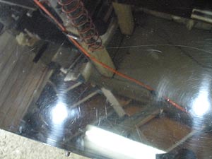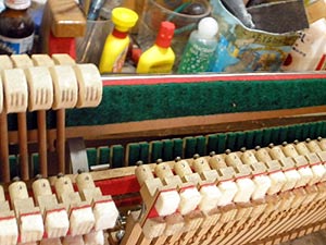 アポロのピアノはこの年代の年月を経過すると必ず不具合が生じてくる特にアクションの動きの悪さは、歴然として出てくるわけだ、今このように弦を磨くがこの作業は