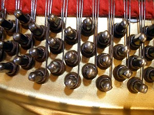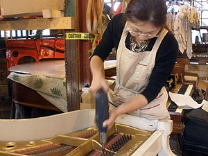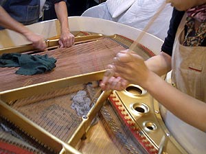 アクションにはスプリングを使い構成されているサポートという部品とハンマーシャンク根元に着くローラーとの関係、はたまたハンマーと弦との位置関係、あたり、または音を伸ばすペダルから弦に乗っているダンパーヘッドまでの部品の動き、すべり、等すべてをあわす作業は
