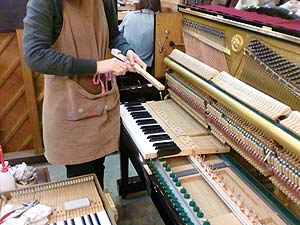 整調作業、とても地味な作業なのだがこの整調ひとつでまるで違うピアノのように大変身できる。正確なピアノ熟練が必要なところだ、根気と精密さが要求されるのだ