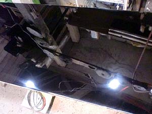 つめ傷にて蛍光灯の電球が城鍵盤に映らない、