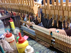 鍵盤が入荷,鍵盤貼りこみ治具にて圧着しながら鍵盤を貼り込んでいく