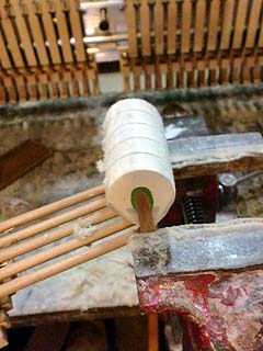 ヤマハW102のハンマー整形作業、アクションをつけたままのファイリングはフレンジ軸部をいためるので必ず固定しなければならない