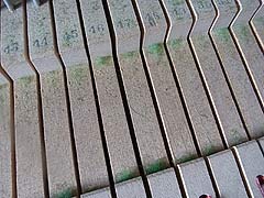 さび付いたバランスキーピンとフロントキーピンこのぐらいさびていると鍵盤の動きはおのずとわかる感じだ
