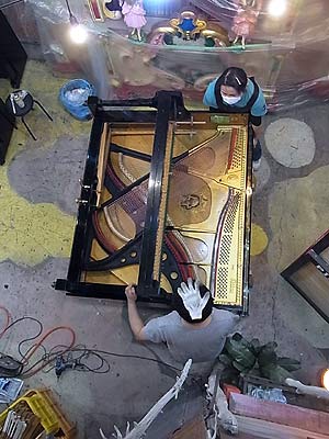 ピアノ本体を寝かして底板分解作業