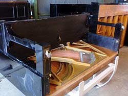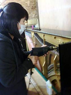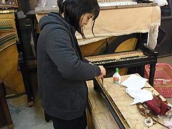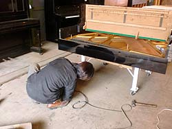 ピアノを寝かして底板のはずし作業と弦磨き作業「