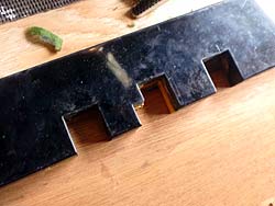 鍵盤下はほこりがたまっています ハンマーは使った形跡がくっきりと弦溝となりついています