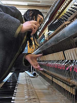 前の調律師さんがひもで止めて簡易修理されているところを