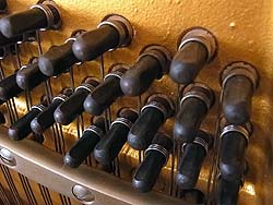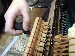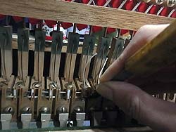 フレンジコード、ハンマーが装着されているので除きこんでも見えないところにある部品、このコードはハンマーが飛び出し次に戻る時に大きな役割を果たすのと打弦時の強さを余すことなくハンマーに力を伝える役目を果たす重要なところなのだ