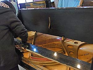 鍵盤を入れアクションを入れる、ハンマー整形、鍵盤クリーニング等も終了している、ナベサンが弾く