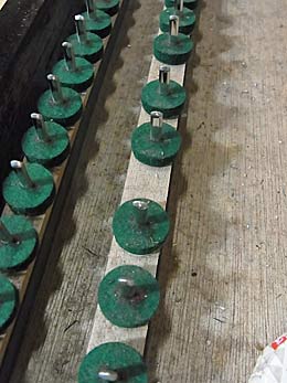 バランスキーピンの磨き、この部分は鍵盤下に位置するので覗きこんでも見えないところでもあるが