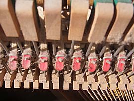 意外に気が付かないペダル部分。演奏上でのペダルの雑音はこのつぶれたクッションクロス系を貼りかえてあげることにより、大幅にペダリングの改善につながり、大幅な雑音低下にもつながるのだ