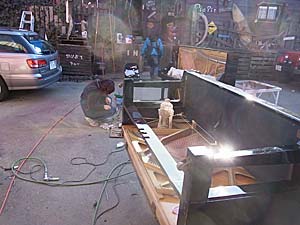 ピアノを寝かして底板分解作業