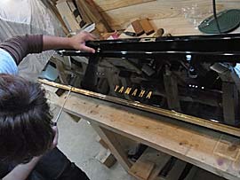 ピアノ本体を寝かして底板をとりペダル分解作業 ペダルもすべて取り外して1本1本磨きこんでいきます