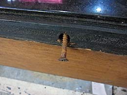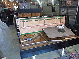 ピアノ本体を寝かして底板分解作業底板のビスはすでにさび付いています