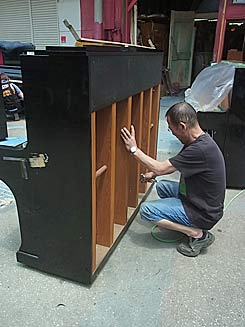 ピアノを寝かして底板の取り外し作業〜〜底板を取り外すことによりより細部にまで目が行き届く