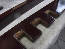 ピアノ本体を寝かして底板の取り外し作業だ底板を止めているビスは全てこのように真赤にさび付いてしまっている