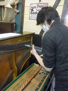 ピアノ本体を寝かして底板の分解作業 ピアノを寝かして分解すると見えないところまであらわになる