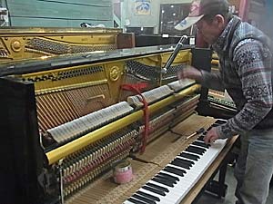 ピアノを寝かして底板の取り外し準備 ピアノ下の方は傷が多いのだ