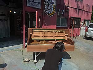ピアノをねかした状態でクリーニング作業一番細部まで目が届く
