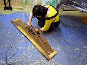 ピアノ本体を寝かして底板の取り外し作業 ピアノが一番湿気を帯びている所でもあり