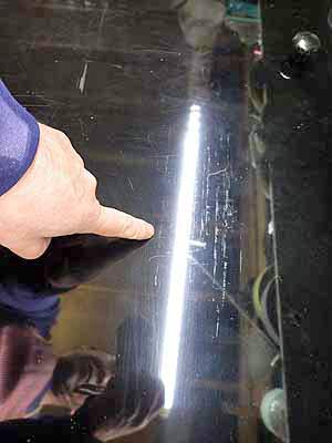 鍵盤表面鍵盤際についた指垢等の汚れも綺麗にクリーニング 鍵盤表面は蛍光灯の下で見るとじっと目を凝らすと爪傷が無数についているのがわかる