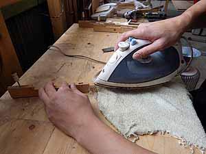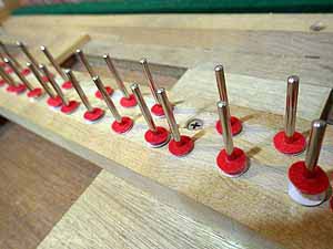 ダンパーレバークロス穴あき 鍵盤を押すと下の錆びた頭のスプーンがこのクロスを押し上げて音を延ばす