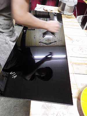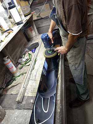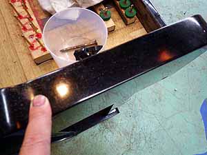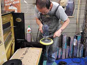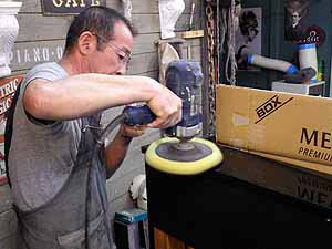 外装パネル磨き作業 この当時のピアノになると妻土台=脚に至るまで塗装ではなく