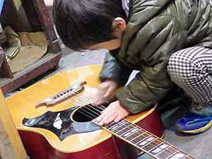 弦磨きクリーニング中 細部にわたって目でしっかり確認しながら作業