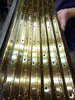 鍵盤木口交換 接着が終了したら機械で鍵盤幅に合わせて出た分をカット
