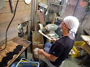 ハンマー整形ファイリング作業 ここは音質に大きくかかわるところなのでベテランの仕事だ