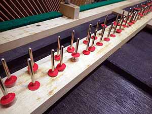 けん盤下位置にあるバランスキーピンとフロントキーピン磨き、ここも重要なところだ けん盤下に隠れてしまうところにあり磨くのも時間もかかるところで