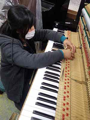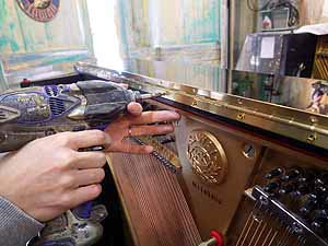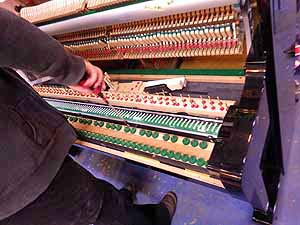 ピアノを寝かして底板等を取り外す〜〜細かいところまで目が行き届くのでしっかり見ておきたい