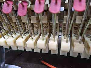 鍵盤ブッシングクロスの虫食い交換 ここは鍵盤運動の左右を制御するところ、ブッシングが無くなると鍵盤はガタガタになる