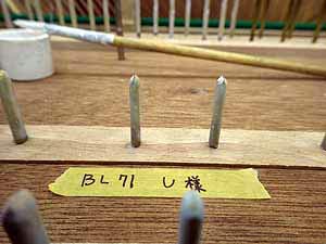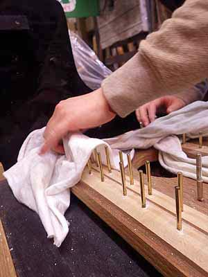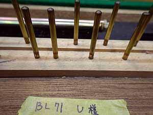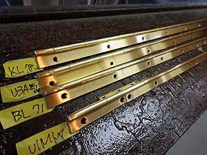 けん盤下位置にあるバランスキーピンとフロントキーピン磨き、ここも重要なところだ けん盤下に隠れてしまうところにあり磨くのも時間もかかるところで