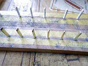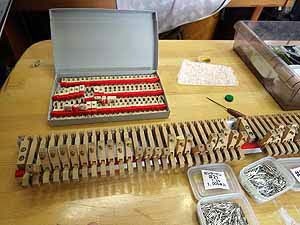 このままでも使えるがこのピン手前に垂直になっているのが普通なのだが隙間に応じて楕円形のピンの向きを変えて隙間調整しているピンなのだ、あまりにピンが横向きになると鍵盤フロントホールには相当広がっている