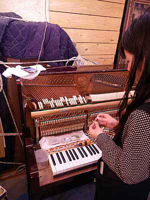 ピアノを寝かして底板等の取り外し作業、底板を止めているビス関係は