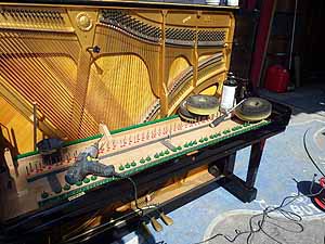 ピアノ本体を寝かすと見えないところまで見えてくる こういう時に細部にわたってチェック点検を施したい