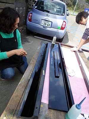 ピアノ天屋根の磨き作業 塗料はラッカー仕上げだ薄いので要注意が必要だ