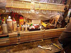 白鍵盤を取り外して鍵盤木口の交換作業から始まる。