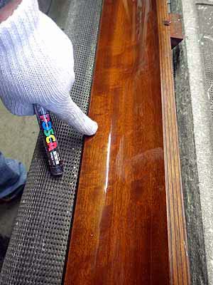 表面のクリアー塗装の塗膜割れ この当時木目のピアノは状に塗られているクリアーの塗膜の割れがあちこちメーカーで起こった
