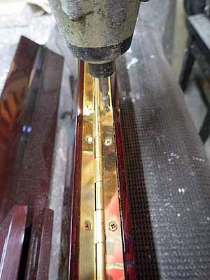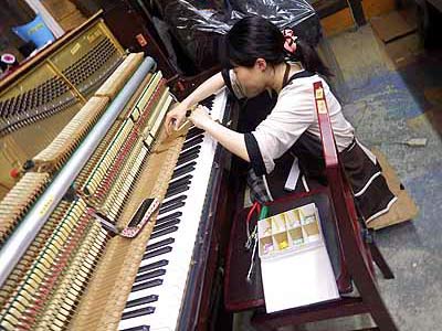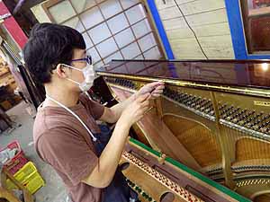 本体にアクションと鍵盤が入り 鍵盤調整ホール調整〜〜上面ナラシ作業