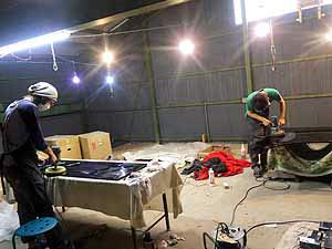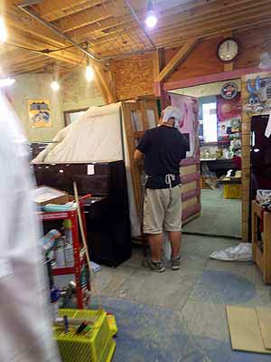 弦磨き作業 ここは機械は使わずウルトラ手作業の世界 音色もぼけ始めているので一度天日ほし〜〜〜