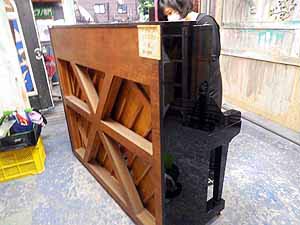 ピアノ本体を寝かして底板の取り外し作業だ