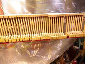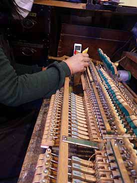 ピアノを横に寝かして底板の取り外し〜ピン関係からのクリーニング作業だ
