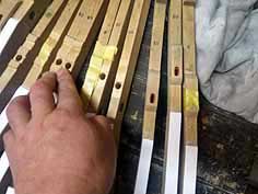 鍵盤キーバックレールクロスの交換、ここはやはりダウンアタックの柔らかいクロスに変更だ、このやり方だと鍵盤上面がそろわなくなるのだ