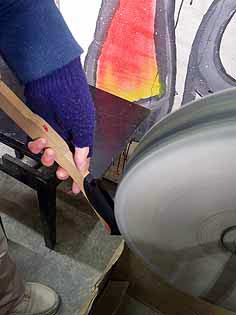 弦磨き 錆が目に入らないようにゴーグル着用 ピアノ裏側は埃にまみれてしまっている