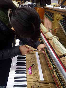 ピアノ本体を寝かしてさらに分解、より細部にまで目が行き届くわけで