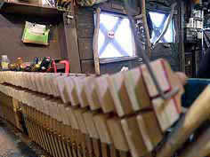 ピアノ本体を寝かして底板の取り外し分解作業 ピアノは寝かすことにより見えなかった部分まであらわに見える