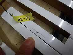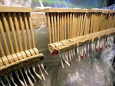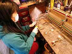 けん盤下位置にあるバランスキーピンフロントキーピンの磨き作業、ここは重要なポイントでもある